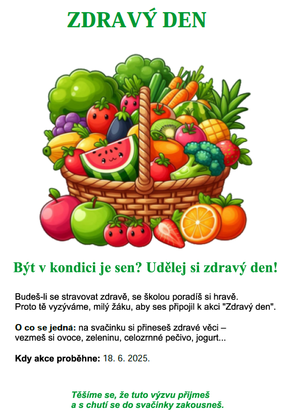 Žákovský parlament zve žáky 1. stupně, aby se připojili k akci „Zdravý den“. Bližší informace naleznete v letáku.